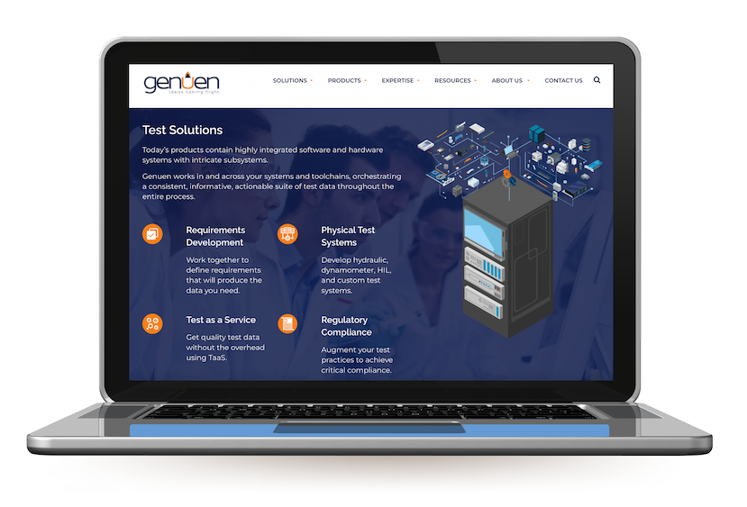 Below is a graphic of a test stand that I designed for Genuen’s homepage. The background image on this module is actually a stock photo with a dark blue overlay. I carefully designed this module to showcase Genuen’s custom test solution offerings while also using people in the background to make the design seem more authentic.