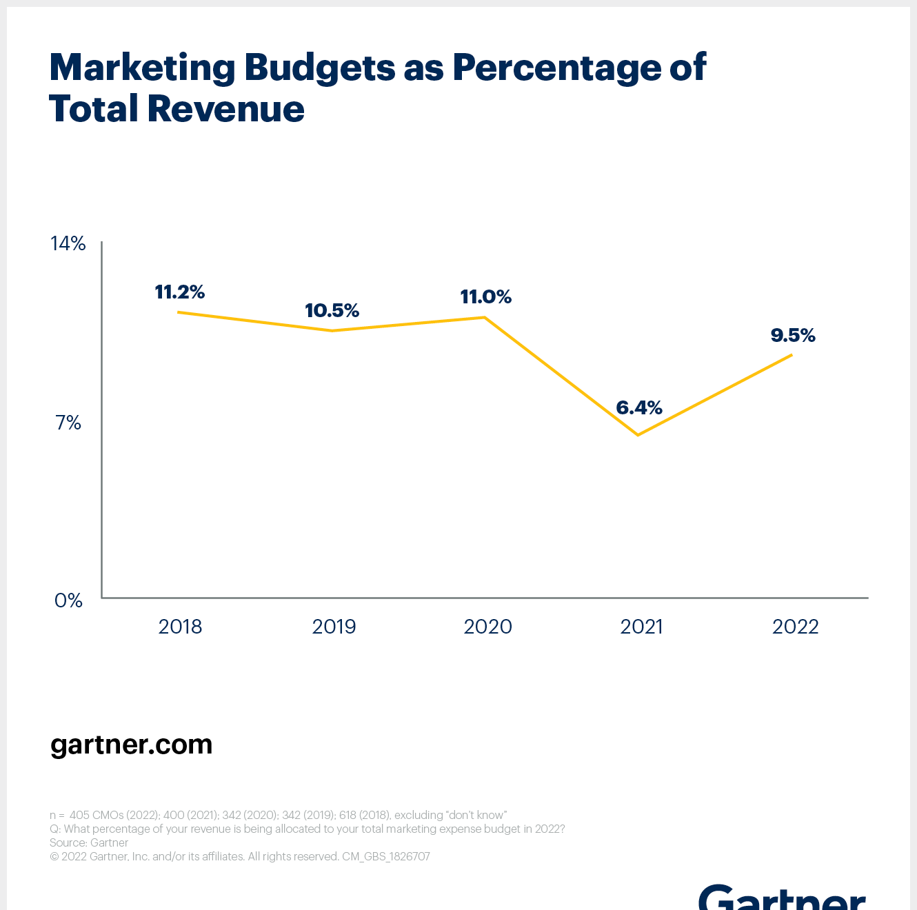 According to Gartner, the average marketing budget today is 6.4% to 9.5% of a company’s revenue across almost all industries.