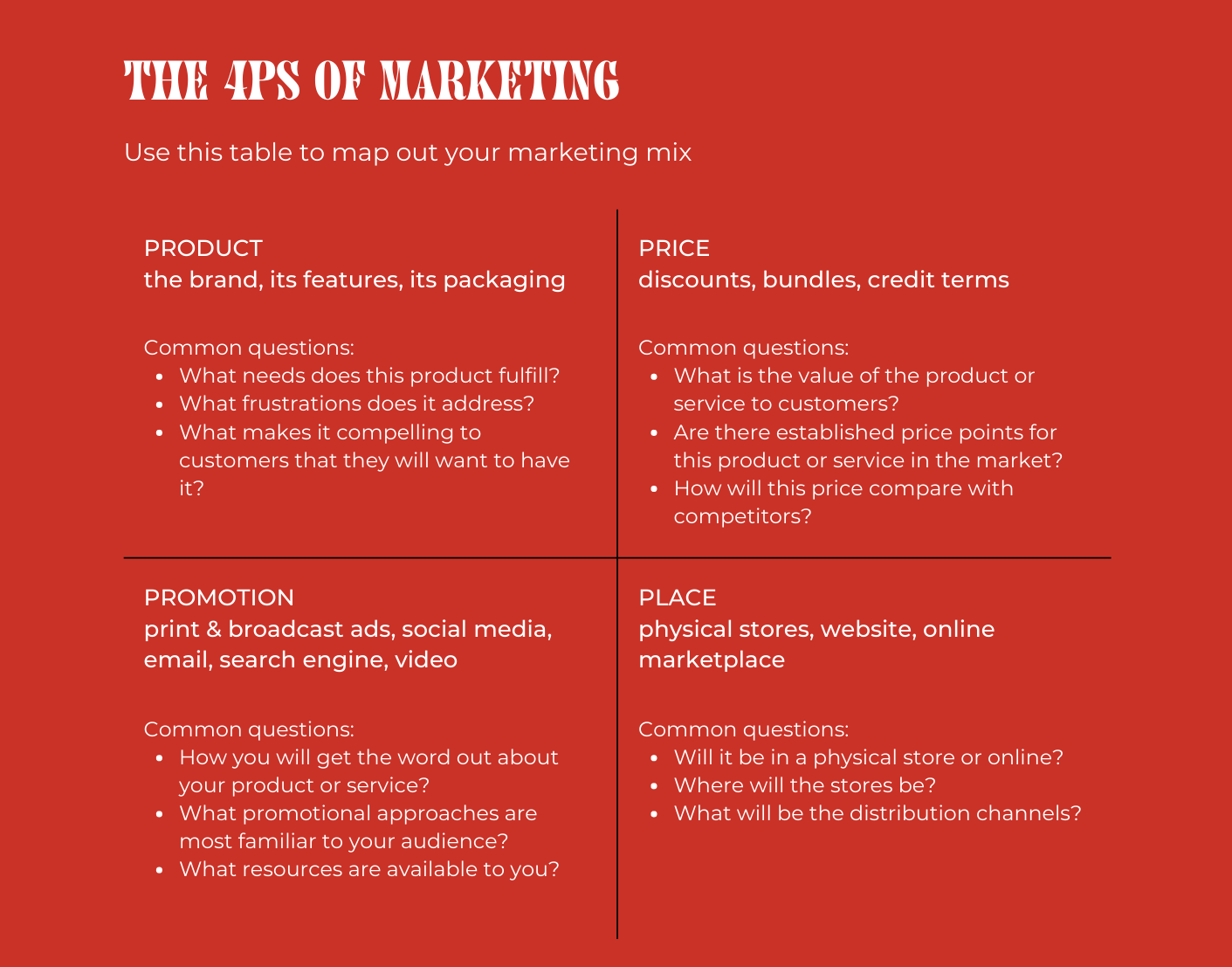 Be sure to strategize the 4Ps: product, price, promotion, and place.