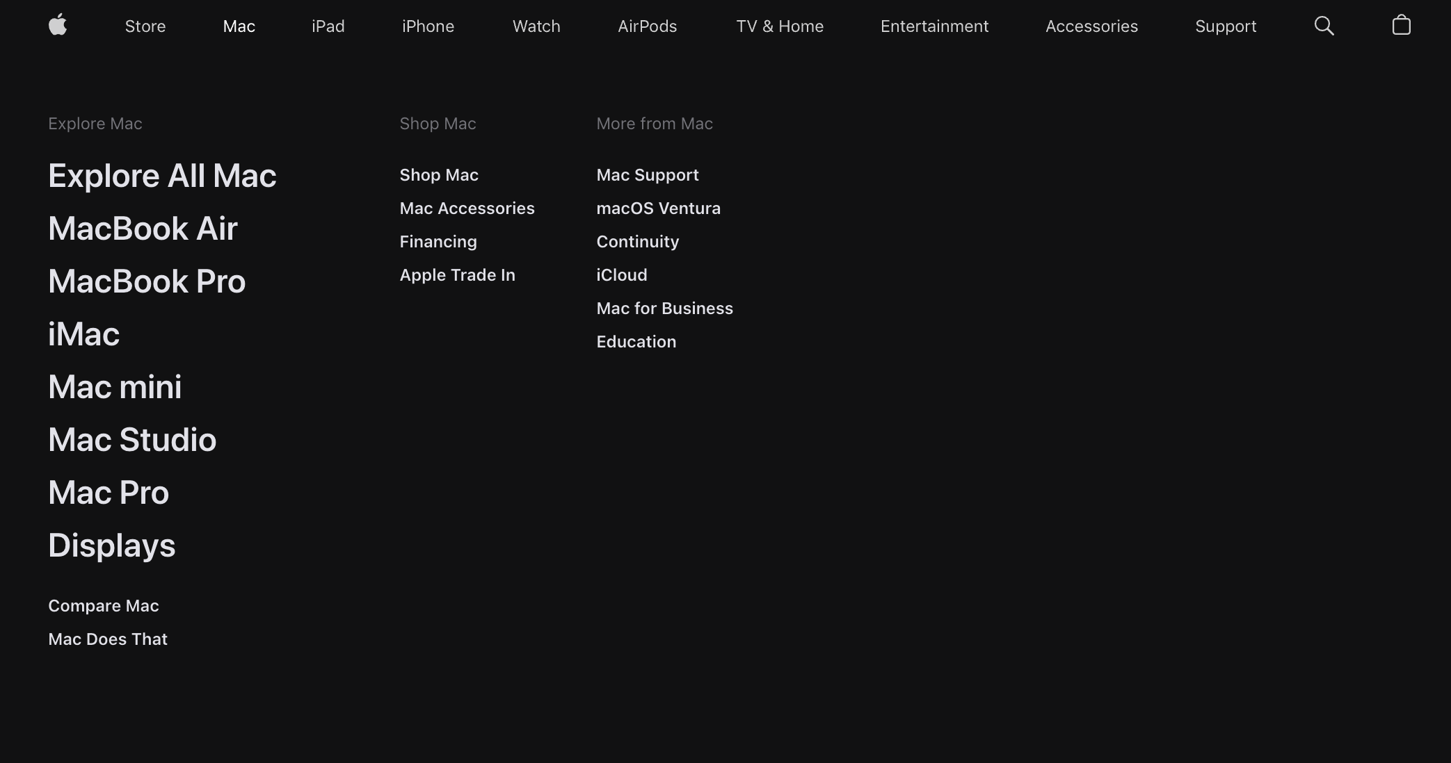 Apple’s main navigation menu is sleek and simple. This is an example of a good user experience that is simple and easy to navigate.